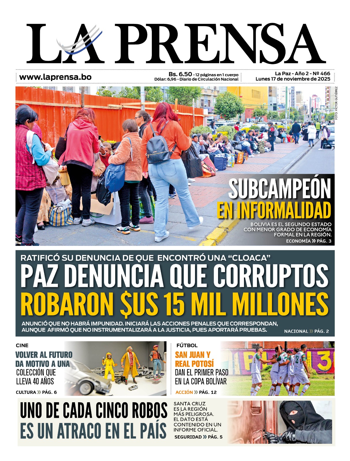 16/11/2025.- El presidente Rodrigo Paz advirtió este domingo que las primeras evaluaciones realizadas por su gobierno, a solo siete días de gestión, revelan un posible robo al Estado de más de 15.000 millones de dólares. Aunque la cifra aún debe ser certificada, el mandatario la calificó como “una tragedia nacional” que compromete el futuro del país.