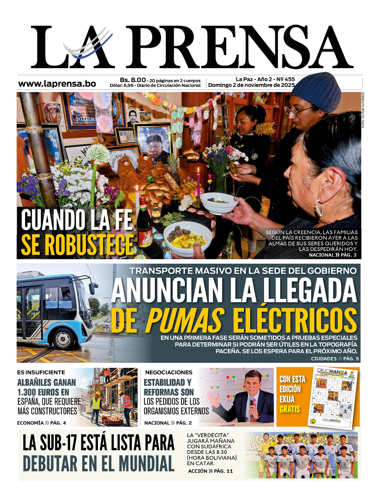 30/10/2025.- “¿Limpio el nicho?” o “¿Quiere escalera?” se escuchaba. Un visitante ingresa al Cementerio General de La Paz, mientras hay personas que ofertan su trabajo por unos bolivianos. En el interior del camposanto familiares limpian y cambian las flores de los nichos. Entretanto, en otro sector, varios jóvenes que pertenecen al colectivo Perros Sueltos trazan los detalles de los 12...
