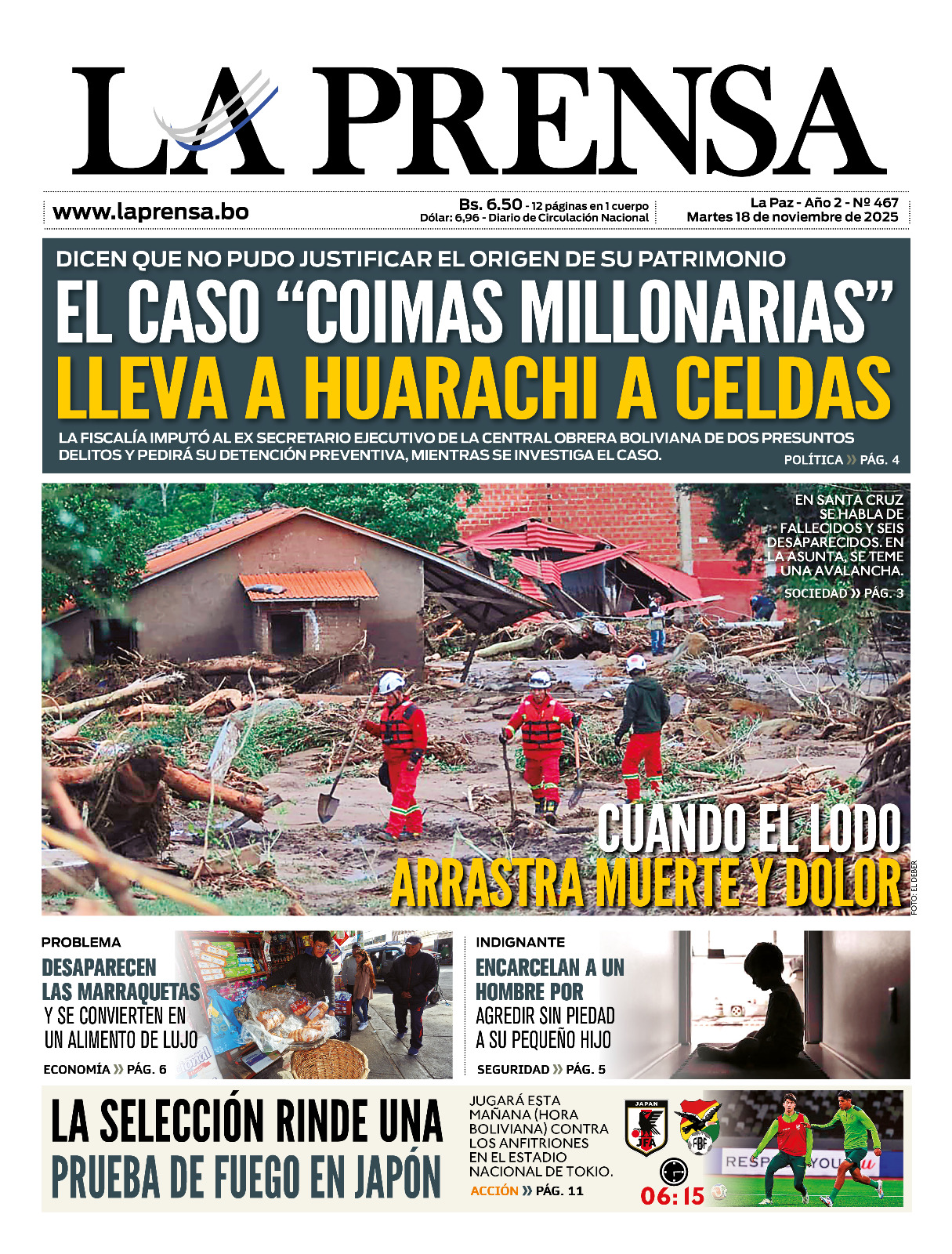 17/11/2025.- El exejecutivo de la Central Obrera Boliviana (COB), Juan Carlos Huarachi, fue aprehendido este lunes y será imputado por la Fiscalía, que anunció que pedirá su detención preventiva al encontrar indicios de que habría recibido dinero del Ministerio de Medio Ambiente y Agua, y presuntamente de otras entidades como la Caja Nacional de Salud (CNS).