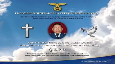 El Comando General de la Fuerza Aérea Boliviana expresó sus condolencias ante la pérdida del suboficial Luis Morales Huanca. El uniformado perdió la vida durante el reciente desastre aeronáutico que impactó a la urbe alteña. Mediante un comunicado oficial, la institución militar manifestó su pesar y solidaridad con los allegados del oficial en este difícil momento.