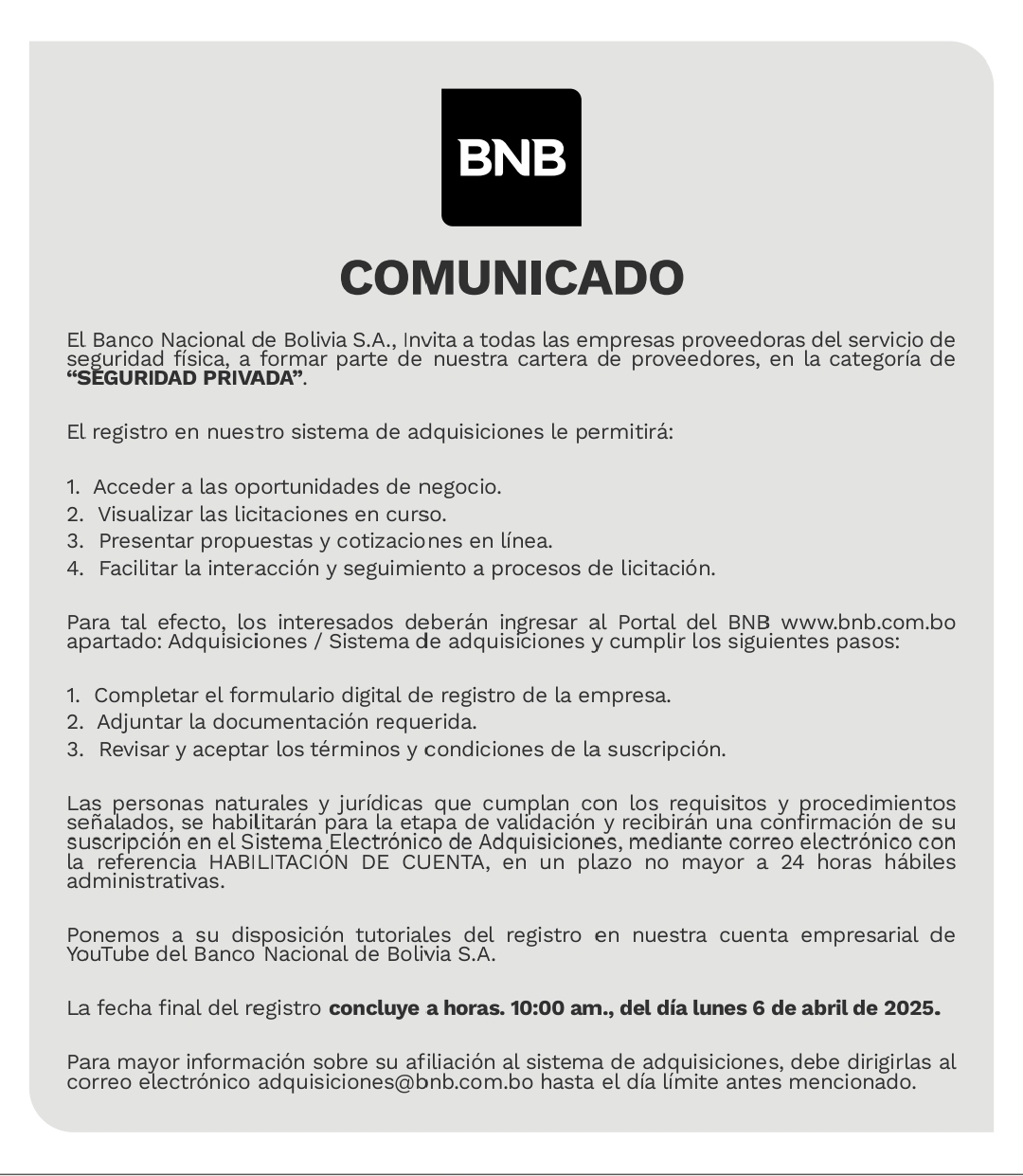 4/4/2026.- El Banco Nacional de Bolivia S.A. (BNB) lanzó un comunicado en el que invita a empresas proveedoras del servicio de seguridad física a formar parte de su cartera de proveedores en la categoría de seguridad privada, con el objetivo de ampliar su sistema de adquisiciones y generar nuevas oportunidades de negocio.