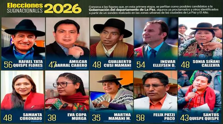 Entre los precandidatos que ya participan activamente en la conversación ciudadana, se encuentran líderes de distinta trayectoria, desde exautoridades como Félix Patzi y el actual gobernador Santos Quispe, hasta figuras con un perfil más joven y de base, como Eva Copa, Mamani Martha y Samanta Coronado. La lista también incluye a experimentados políticos y académicos como Tata Quispe, Amilcar Barral, Ingvar Ellefsen, Sonia Siñani Callisaya y el exmagistrado Gualberto Cusi, quienes impulsan agendas centradas en la fiscalización, la gestión técnica y los derechos indígenas.