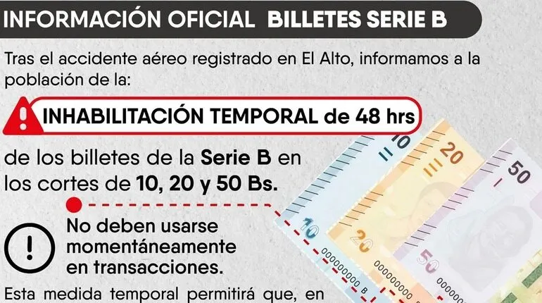 La administración financiera determinó la suspensión de la validez legal de los cortes de 10, 20 y 50 bolivianos pertenecientes a la Serie B durante un lapso de 48 horas. Esta restricción concluye el lunes, momento en que las piezas recuperan su vigencia plena para cualquier transacción. Durante este intervalo, las instituciones oficiales difundirán los números de serie específicos de los billetes robados para que la población logre identificarlos y prevenir su aceptación en el sistema de pagos nacional.