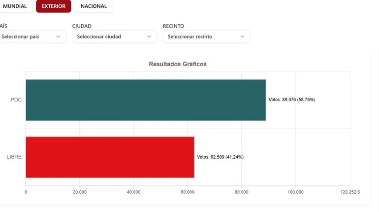 Los resultados finales del Tribunal Supremo Electoral (TSE) en el extranjero mostraron una victoria del PDC con el 58.76% de los votos, frente al 41.24% alcanzado por Alianza Libre.