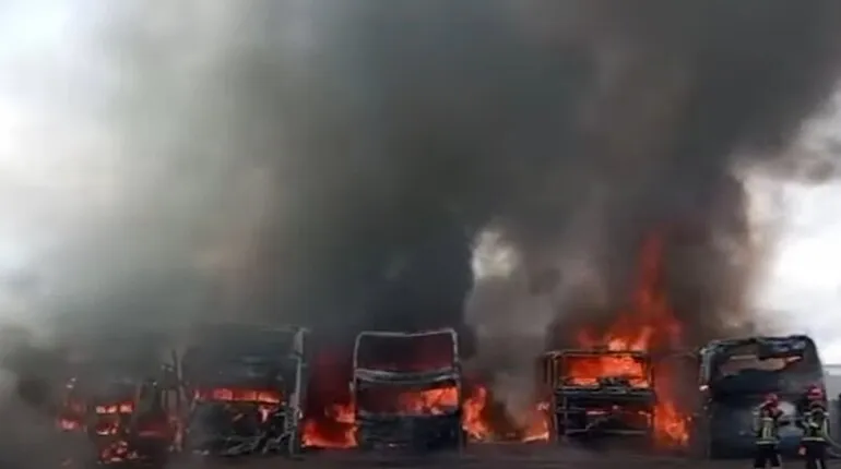 Un siniestro de considerables proporciones afectó este jueves a un establecimiento de mantenimiento y estacionamiento de vehículos de transporte pesado en la avenida Circunvalación, cerca de la nueva terminal de buses. El fuego alcanzó al menos a seis flotas, lo cual generó densas columnas de humo visibles desde distintos puntos de la ciudad. La combustión de neumáticos y residuos de combustible, sumada a las ráfagas de viento en la zona, dificultó las tareas iniciales para sofocar las llamas.