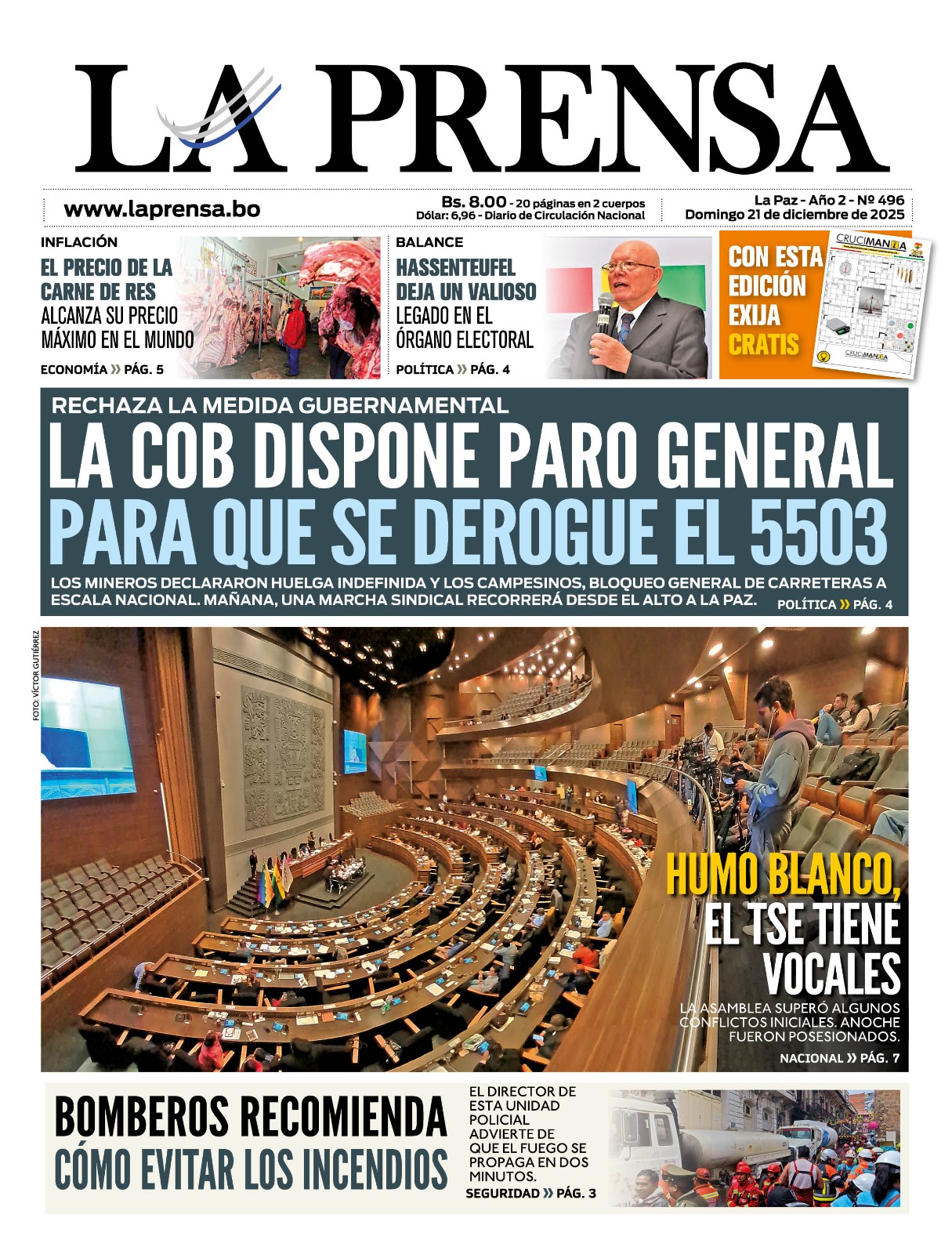21/12/2025.- El pleno de la Asamblea Legislativa Plurinacional determinó el inicio del descanso parlamentario correspondiente al cierre de gestión, el cual entrará en vigencia a partir del próximo 25 de diciembre. La resolución, aprobada durante la quinta sesión ordinaria, establece que las actividades parlamentarias regulares se retomarán el 8 de enero de 2026. Esta medida cumple con el...