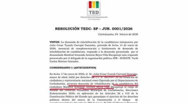 5/2/2026.- El Tribunal Electoral Departamental de Cochabamba confirmó la plena vigencia de la candidatura de Manfred Reyes Villa al sillón municipal de Cercado. Mediante la resolución TED-SP-JUR 001/2026, la Sala Plena declaró improbada la...