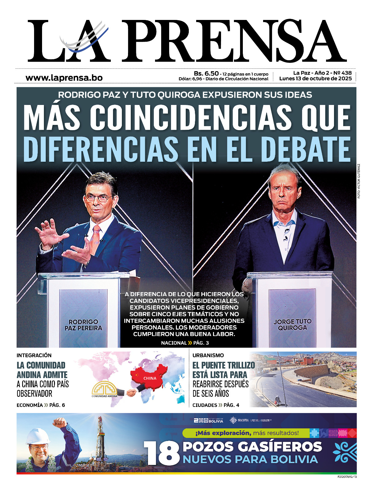 13/10/2025.- Durante el debate presidencial, el candidato del PDC, Rodrigo Paz, propuso la instalación de una cumbre para reformar la justicia en Sucre, capital de Bolivia, en caso de ser electo. "El 9 de noviembre estamos instalando, si es que nos permite el pueblo de Bolivia y Dios mediante, un gran encuentro por la justicia en Sucre", afirmó Paz, señalando que en el encuentro se abordarían...
