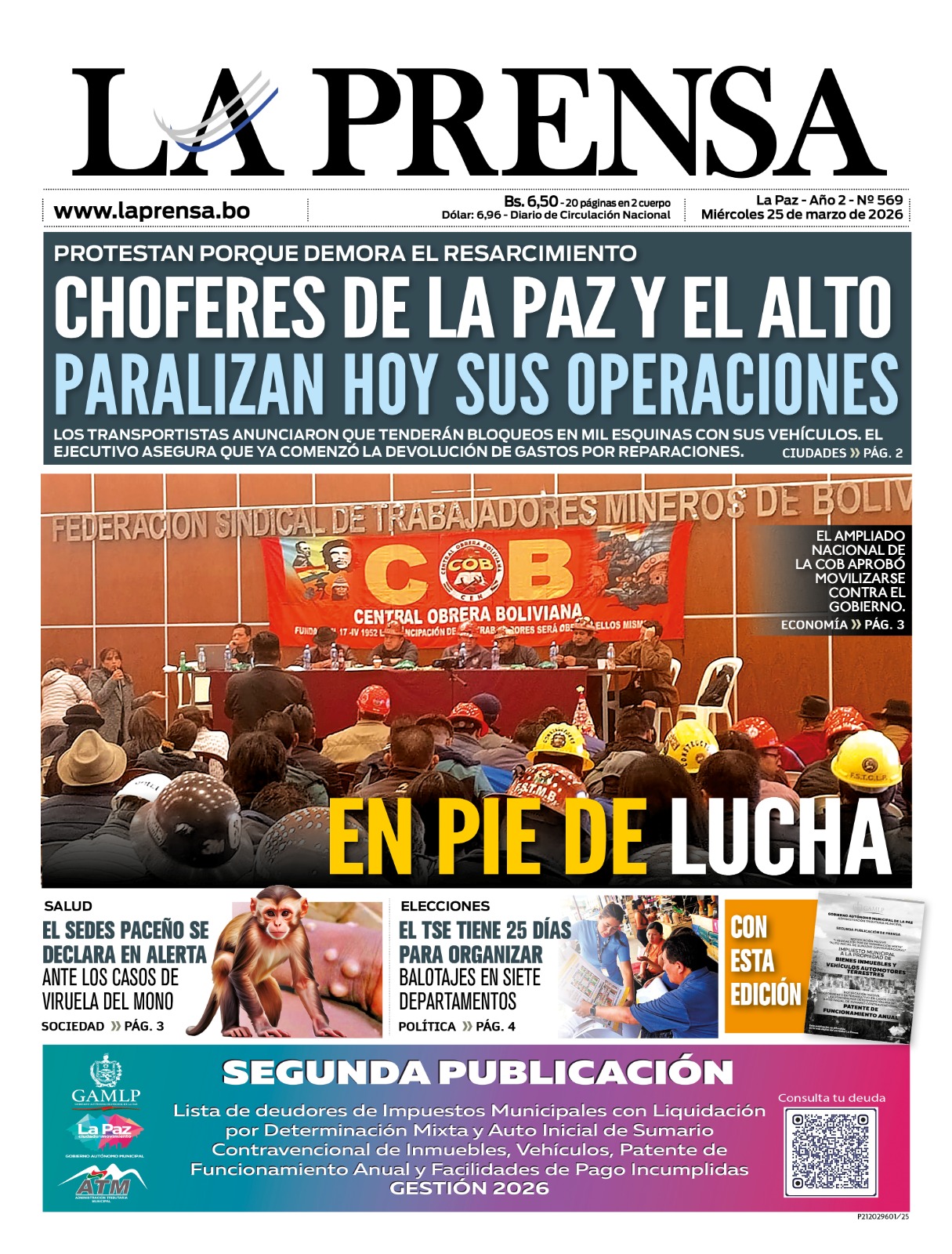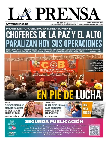 El sector del transporte sindicalizado de La Paz ratificó una interrupción de actividades a nivel departamental durante la jornada de mañana. La medida de presión contempla el despliegue de conductores en puntos estratégicos y el cierre de vías...