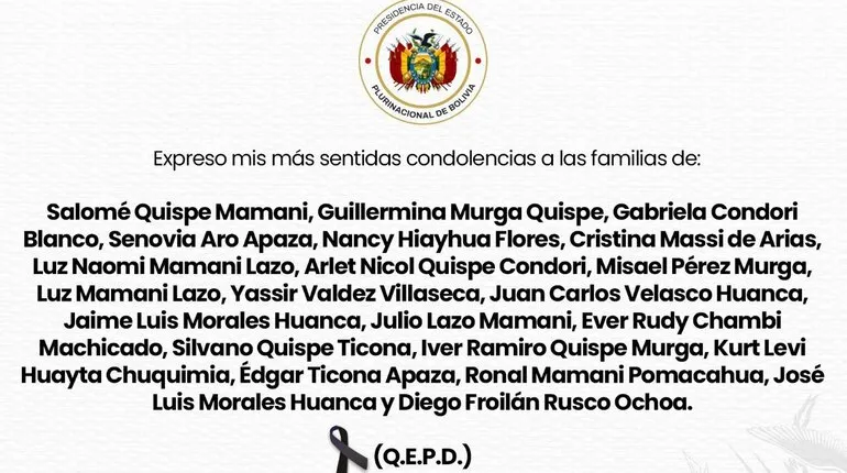 La lista oficial incluye nombres como Salomé Quispe Mamani, Guillermina Murga Quispe y los oficiales Jaime Luis Morales Huanca y José Luis Morales Huanca, entre otros ciudadanos que se encontraban en el lugar de la colisión. Los peritajes continúan para determinar las circunstancias exactas que provocaron que el transporte militar, que trasladaba material monetario, no lograra detener su marcha de forma segura. Mientras tanto, los actos de velatorio se desarrollan en distintas zonas del país bajo un ambiente de profunda consternación nacional.