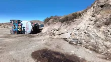 27/10/2025.- Un camión cisterna con placa boliviana que transportaba más de 20.000 litros de gasolina se volcó este domingo sobre la calzada en el kilómetro 101 de la ruta 11-CH, en Chile, según...