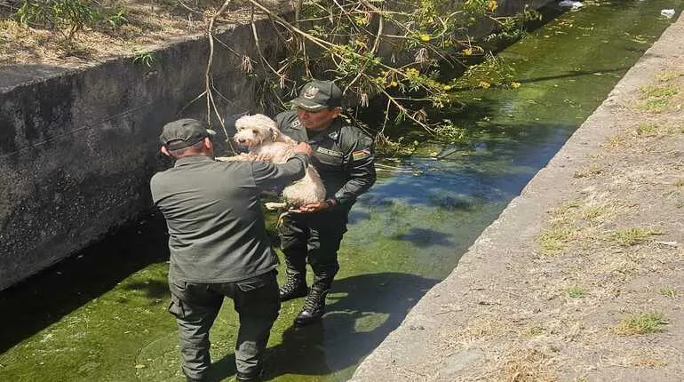 1/12/2024.- Durante un patrullaje preventivo por la avenida Tadeo Haenke, el subcomandante Cnl. DESP. Rubén Alberto Cornejo Parra y el subteniente Williams Toroya Martínez rescataron a un perro de raza Chapi que se encontraba atrapado en un canal de agua. Los efectivos, al percatarse de la situación, ingresaron al canal y lograron poner al animal a salvo, verificando que se encontraba en buen estado de salud.