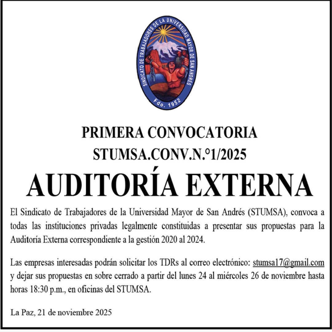 22/11/2025.- El Sindicato de Trabajadores de la Universidad Mayor de San Andrés (STUMSA) lanzó una convocatoria dirigida a instituciones privadas para presentar propuestas destinadas a la auditoría externa de la gestión 2020 a 2024. La invitación se formalizó mediante la primera convocatoria STUMSA.CONV.N.º 1/2025.